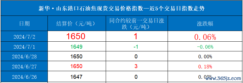 新华财经北京7月2日电(郑大伟) 截至2024年7月2日股票配资资讯平台,新华·山东港口石油焦现货交易价格报1650元/吨,较前一交易日上涨1元/吨,涨幅0.06%。