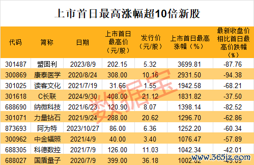 从历史上看,上市首日最高涨幅即超10倍的新股,合计有10只,盟固利最疯狂,上市首日最高涨幅达到近37倍,创造A股历史。不过这些个股多数上市即巅峰,相比上市首日最高价,盟固利、纳微科技跌幅超过80%,而康泰医学更是跌幅超90%。