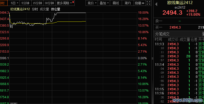 10月11日开盘,集运指数(欧线)期货主力合约继续大涨,开盘价即逼近涨停,随后涨幅有所收窄,临近午间收盘再次拉升至涨停,涨幅为19%。本周以来,集运指数(欧线)价格显著震荡,10月8日、9日连续下跌,近两日又快速反弹,连续出现涨停。