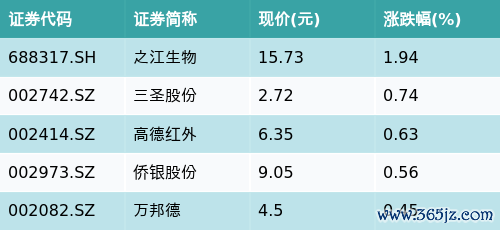 截至收盘网上配资官网,病毒防治主题涨跌幅最高的五只股票为:之江生物(688317.SH)、三圣股份(002742.SZ)、高德红外(002414.SZ)、侨银股份(002973.SZ)与万邦德(002082.SZ)。详情见下表: